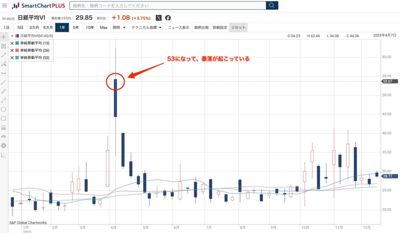日経VIは通常20〜25前後で推移しています。この辺りは安全運転中なので、この時に売ってしまうと等価か、損をしてしまうことになりかねません。