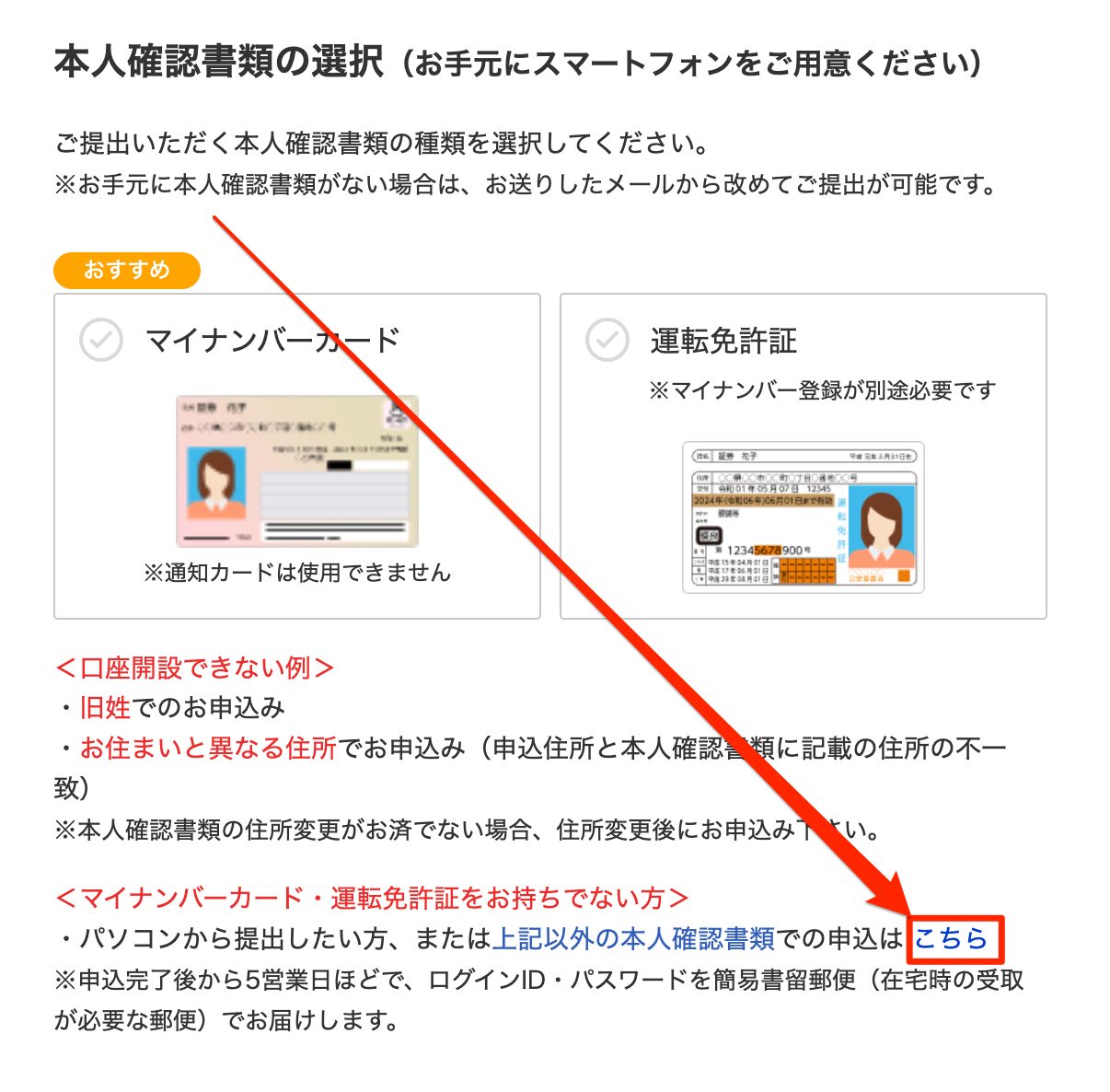 | 3 | 書類アップロードで本人確認 | マイナンバーカード 運転免許証 住民票の写し パスポート など | 約5営業日 | 必要 | ① 口座開設完了までに日数がかかる ② PCでも手続き可能 |